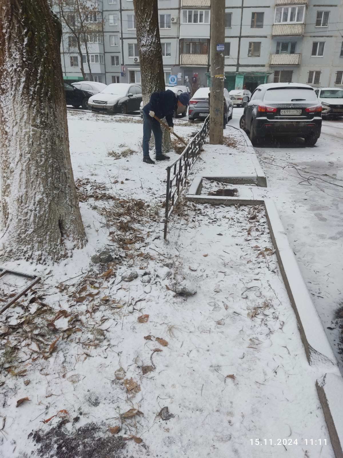 В холодный период года: очистку крышек люков колодцев от снега и льда; сдвигание свежевыпавшего снега и очистка придомовой территории от снега и льда; подметание территории , свободной от снежного покрова; очистка от мусора урн, установленных возле зданий и их промывка; уборка крыльца и площадки перед входом в здание.